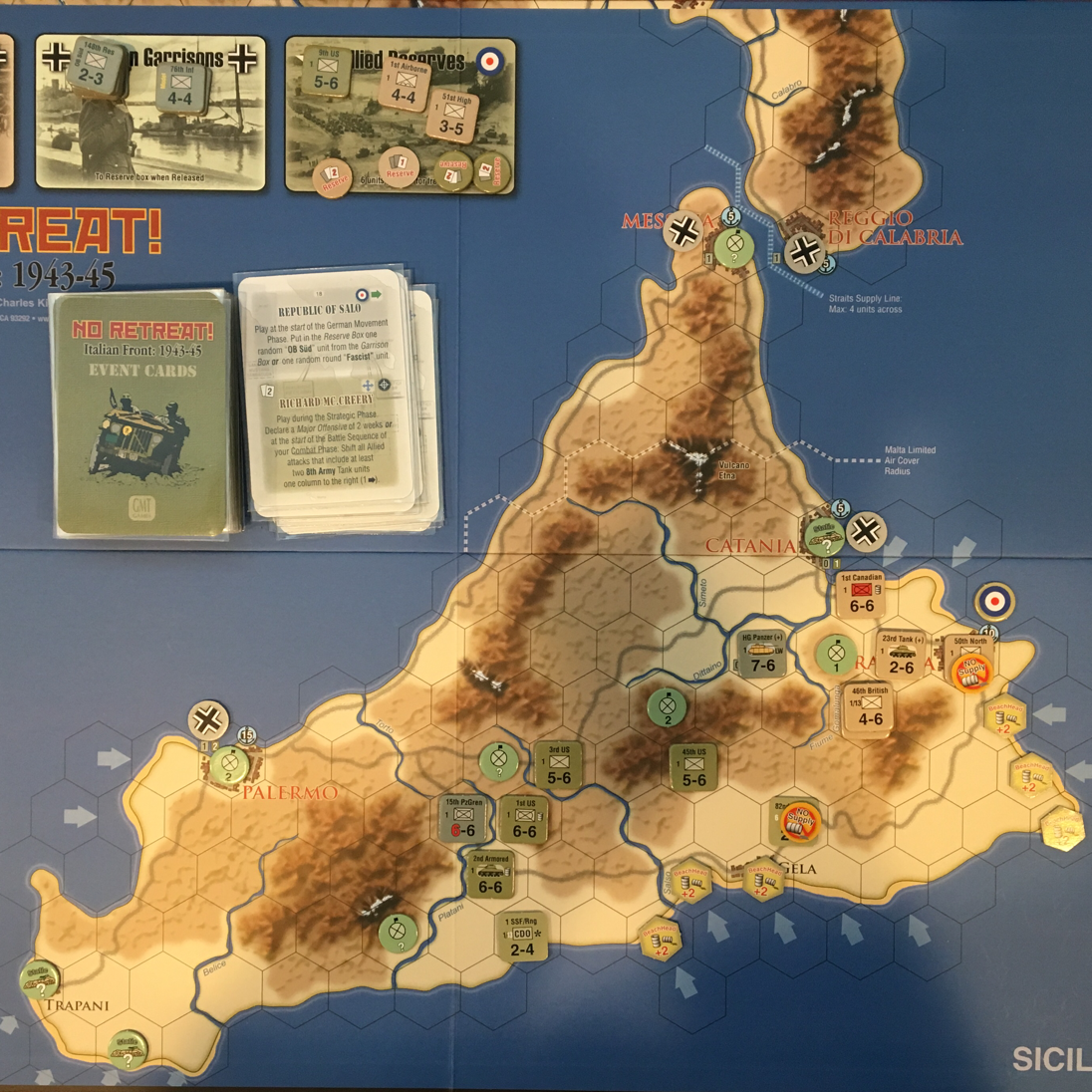 This ends the first full turn. It was a long one, and a bit of confusion around supply, but all in all successful, especially for the Allies. The next turn should be fairly easy, although we will discuss advanced game supply and possibly Attrition. This is the time for the Allies to set up for their mainland invasion, which I plan to perform at the historic site at Salerno on Turn 3 once I've gotten most of the units back to Reserves.